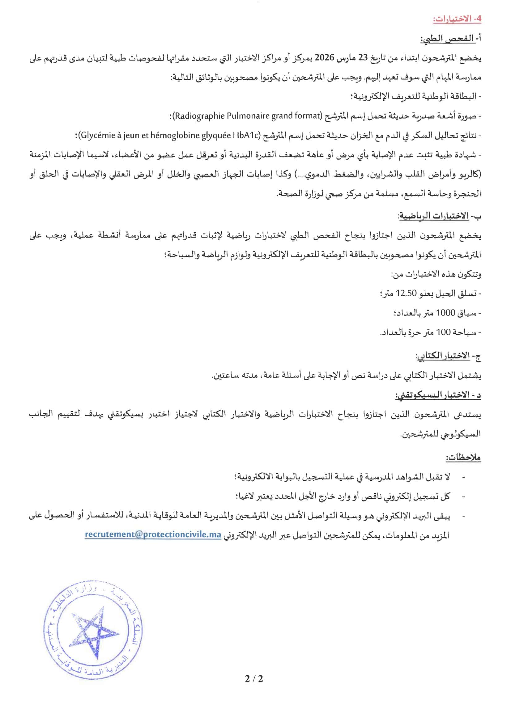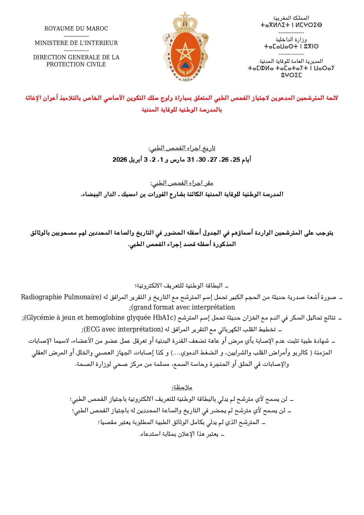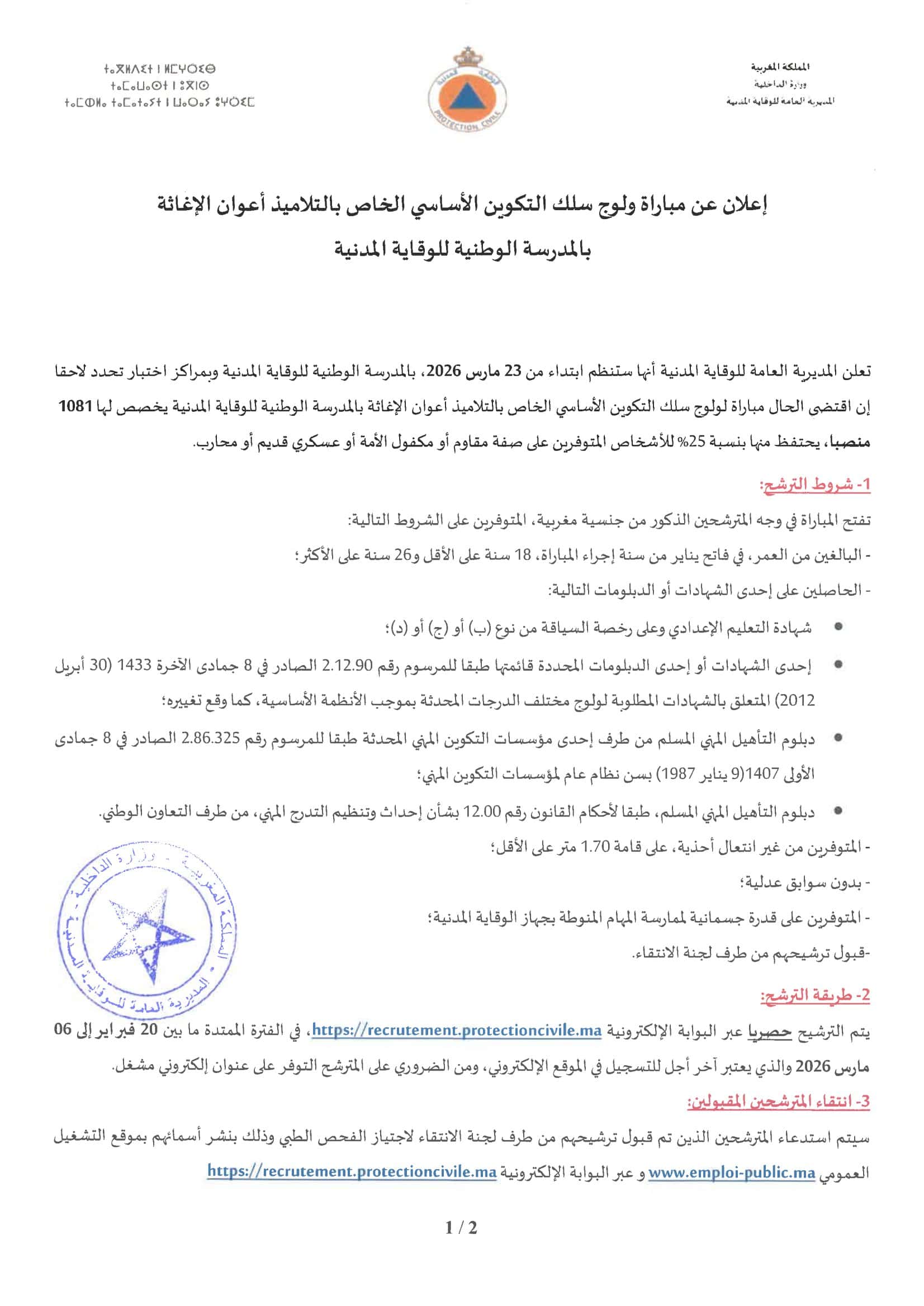 La Direction Générale de la Protection Civile annonce l’organisation, à partir du 23 mars 2026, à l’École Nationale de la Protection Civile et, le cas échéant, dans des centres d’examen qui seront fixés ultérieurement, d’un concours d’accès au cycle de formation de base des élèves agents de secours à l’École Nationale de la Protection Civile.