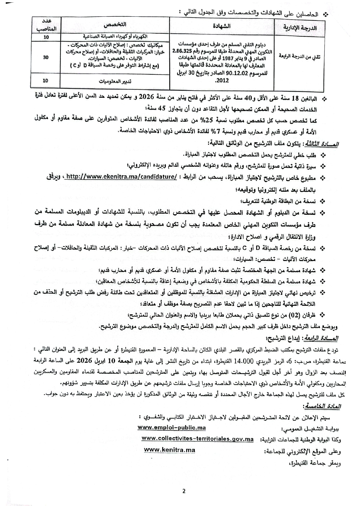 بوابة التشغيل العمومي: www.emploi-public.ma وكذا البوابة الوطنية للجماعات الترابية: www.collectivites-territoriales.gov.ma وعلى الموقع الإلكتروني للجماعة : www.kenitra.ma وبمقر جماعة القنيطرة.