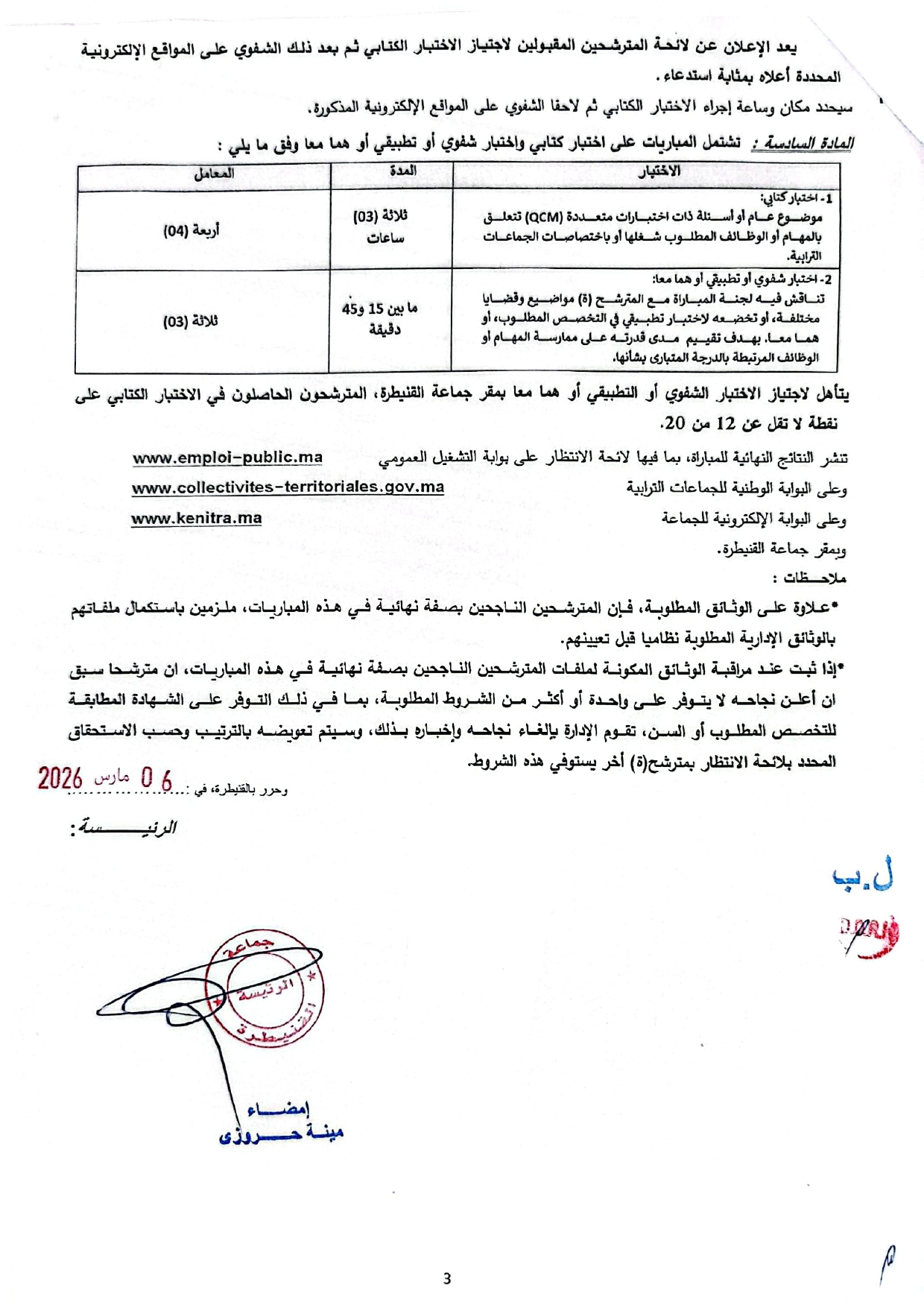 تنشر النتائج النهائية للمباراة، بما فيها لائحة الانتظار على بوابة التشغيل العمومي www.emploi-public.ma وعلى البوابة الوطنية للجماعات الترابية www.collectivites-territoriales.gov.ma وعلى البوابة الإلكترونية للجماعة www.kenitra.ma وبمقر جماعة القنيطرة