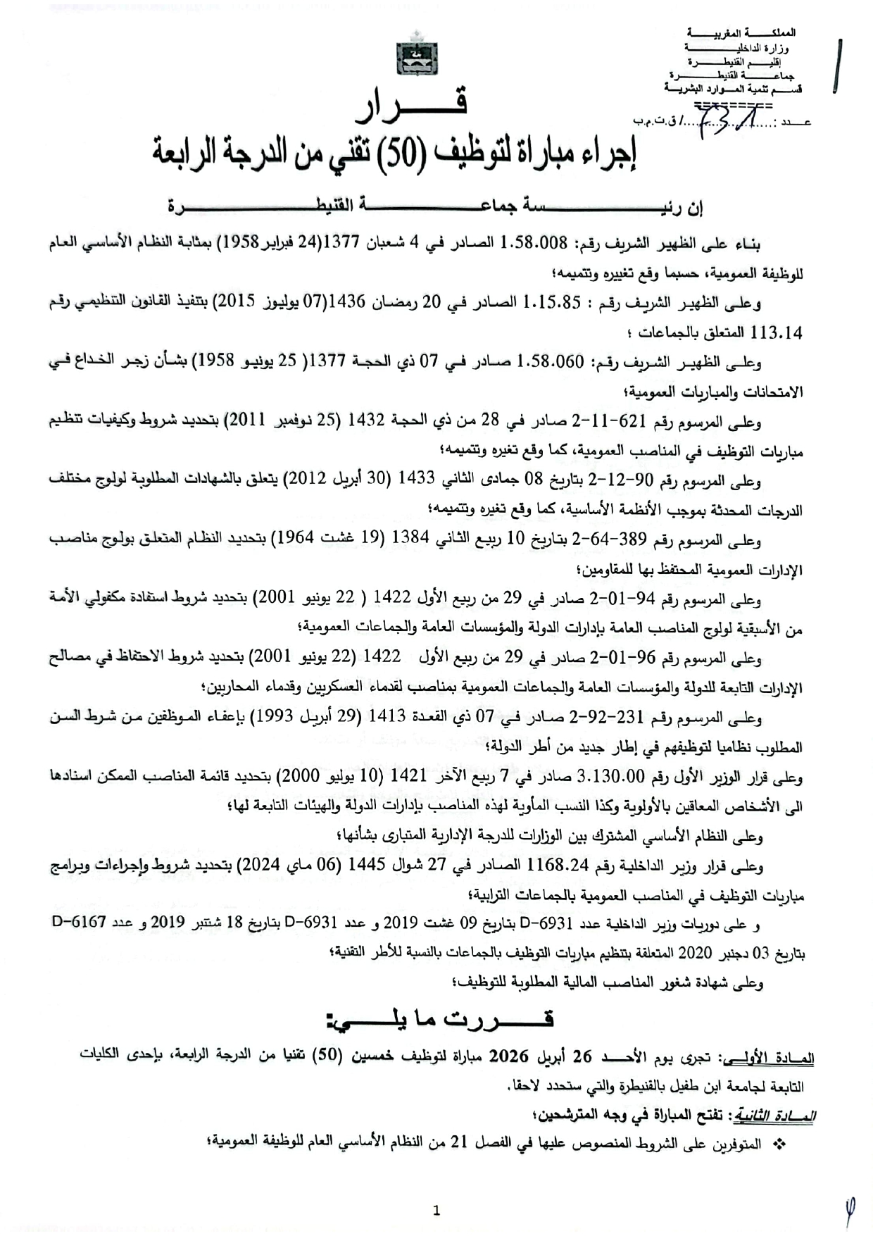 المادة الأولى: تجرى يوم الأحد 26 أبريل 2026 مباراة لتوظيف خمسين (50) تقنيا من الدرجة الرابعة، بإحدى الكليات التابعة لجامعة ابن طفيل بالقنيطرة والتي ستحدد لاحقا.