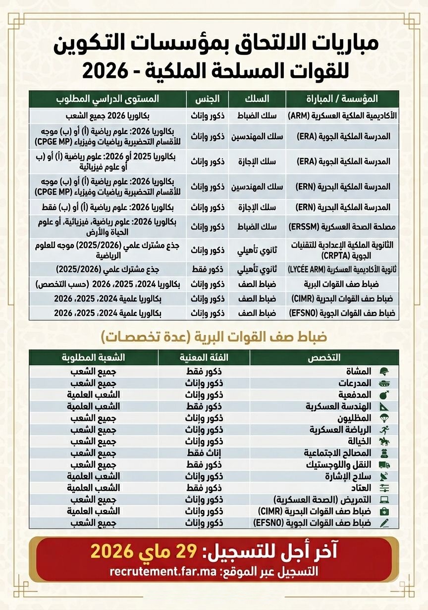 التسجيل في مباريات القوات المسلحة الملكية 2026، تنظم القوات المسلحة الملكية مباراة لفائدة الشباب المغاربة ذكورا وإناثا الراغبين في الانخراط في سلك تلاميذ ضباط الصف بالقوات المسلحة الملكية لسنة 2026.