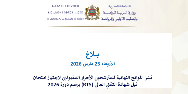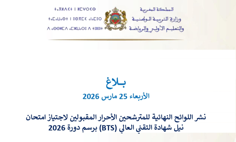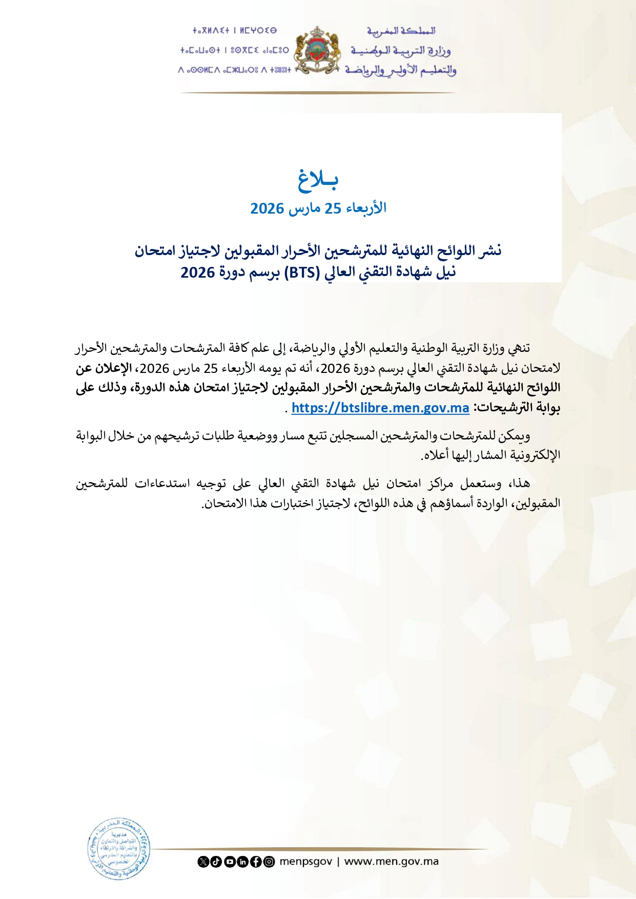 تنهي وزارة التربية الوطنية والتعليم الأولي والرياضة، إلى علم كافة المترشحات والمترشحين الأحرار لاجتياز امتحان نيل شهادة التقني العالي برسم دورة 2026، أنه تم يومه الأربعاء 25 مارس 2026، الإعلان عن اللوائح النهائية للمترشحات والمترشحين الأحرار المقبولين لاجتياز امتحان هذه الدورة، وذلك على بوابة الترشيحات: https://btslibre.men.gov.ma
