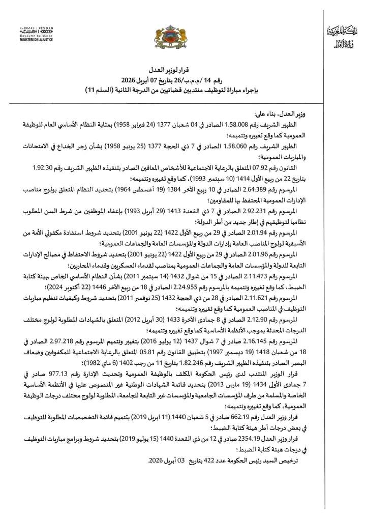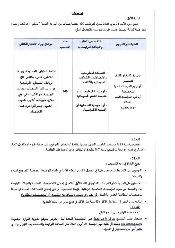 وزارة العدل مباراة توظيف 100 منتذب قضائي من الدرجة الثانية آخر أجل 24 أبريل 2026