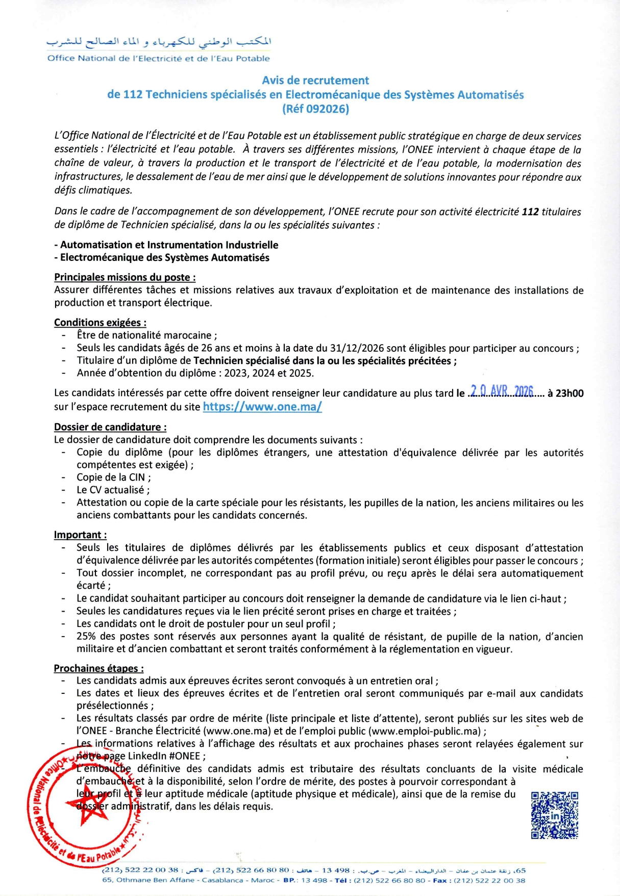 مباراة توظيف 112 تقنيين متخصصين الكتروميكانيك الأنظمة التلقائية بقطاع الكهرباء آخر أجل 20 أبريل 2026