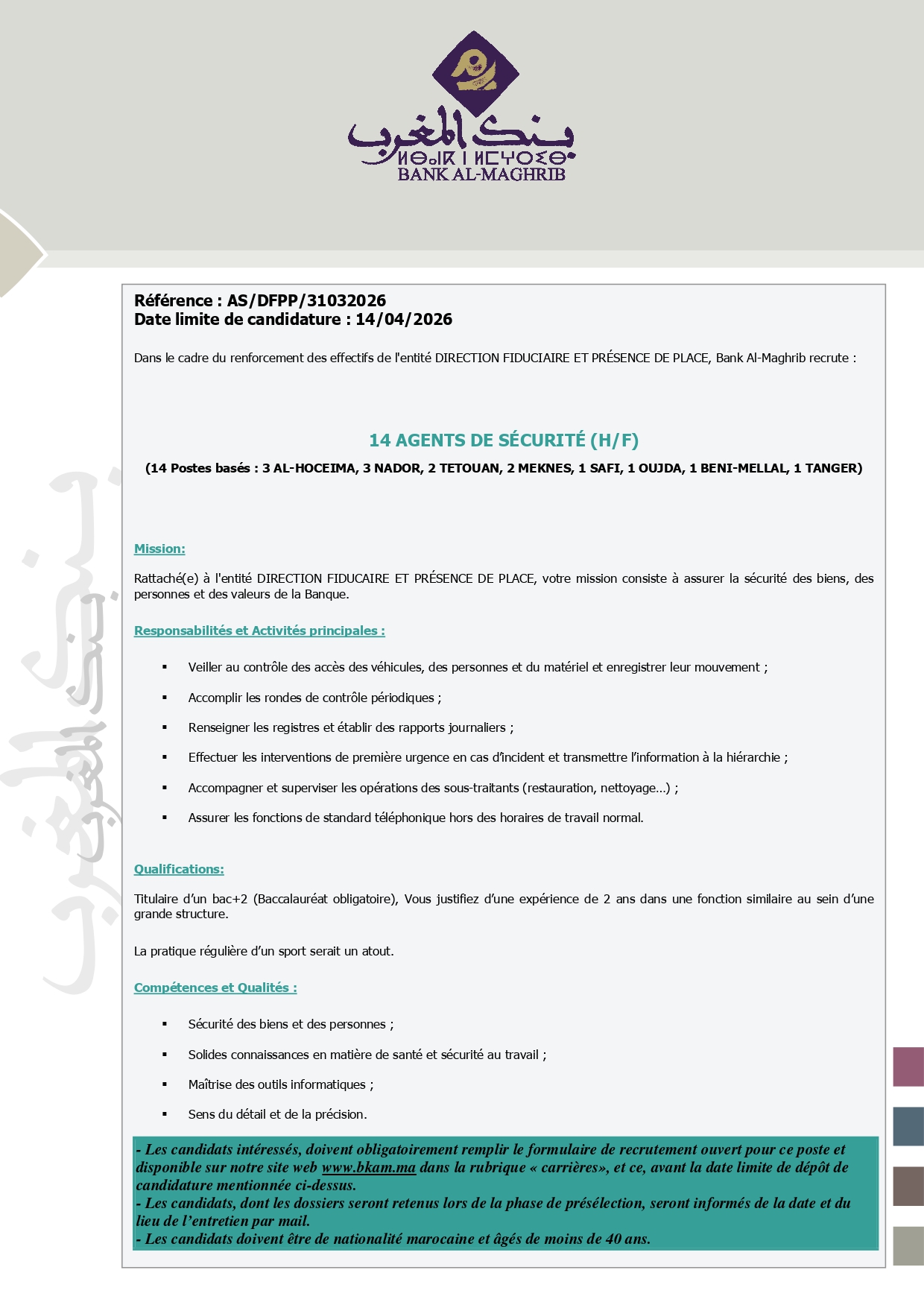 مباراة توظيف 14 حارس أمن ببنك المغرب آخر أجل 15 أبريل 2026
