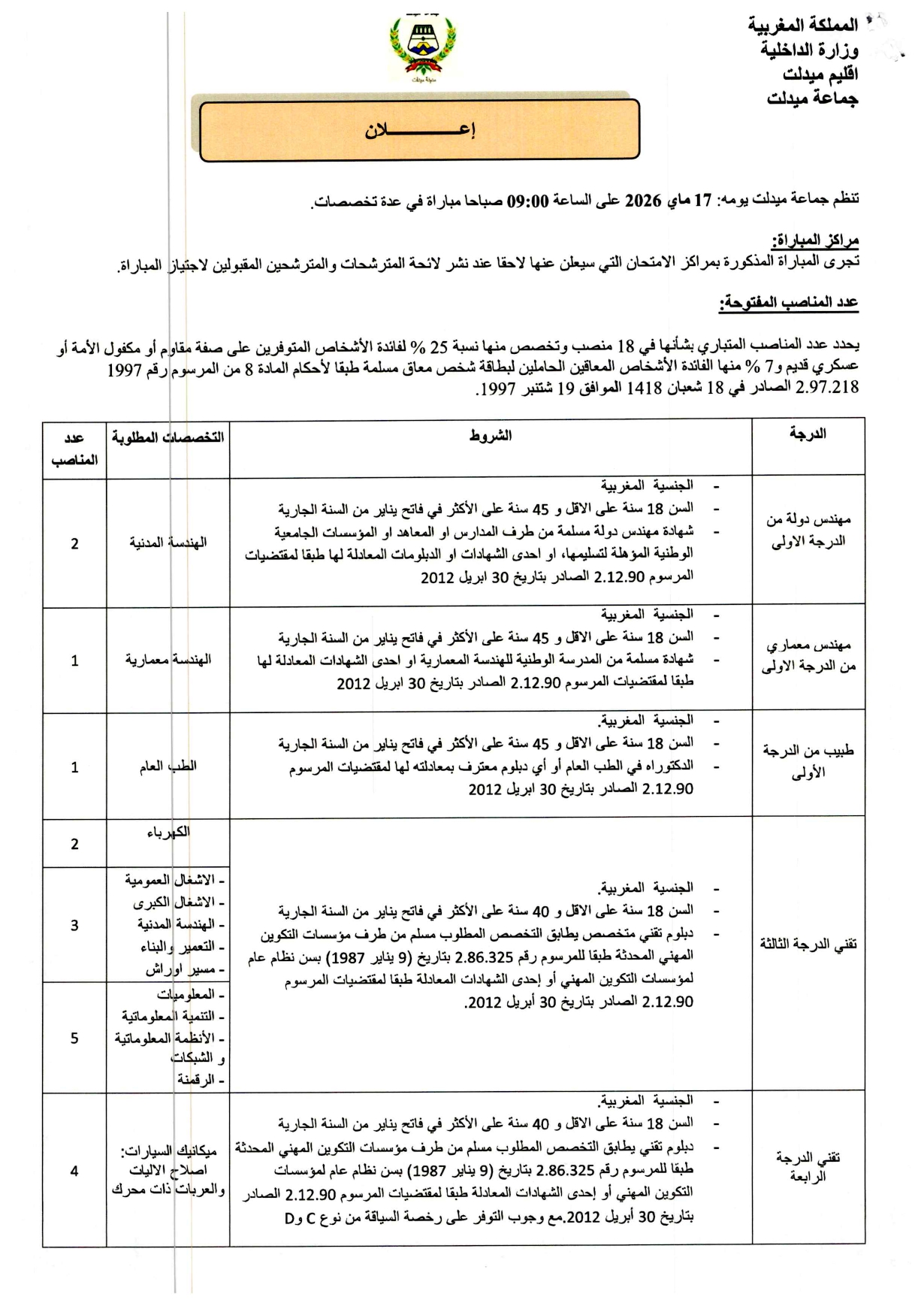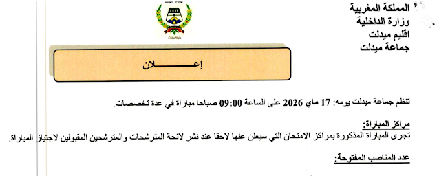مباراة توظيف 18 منصب بجماعة ميدلت آخر أجل 22 أبريل 2026جماعة ميدلت مباراة توظيف 18 منصب آخر أجل 22 أبريل 2026مباراة توظيف 18 منصب بجماعة ميدلت 2026
