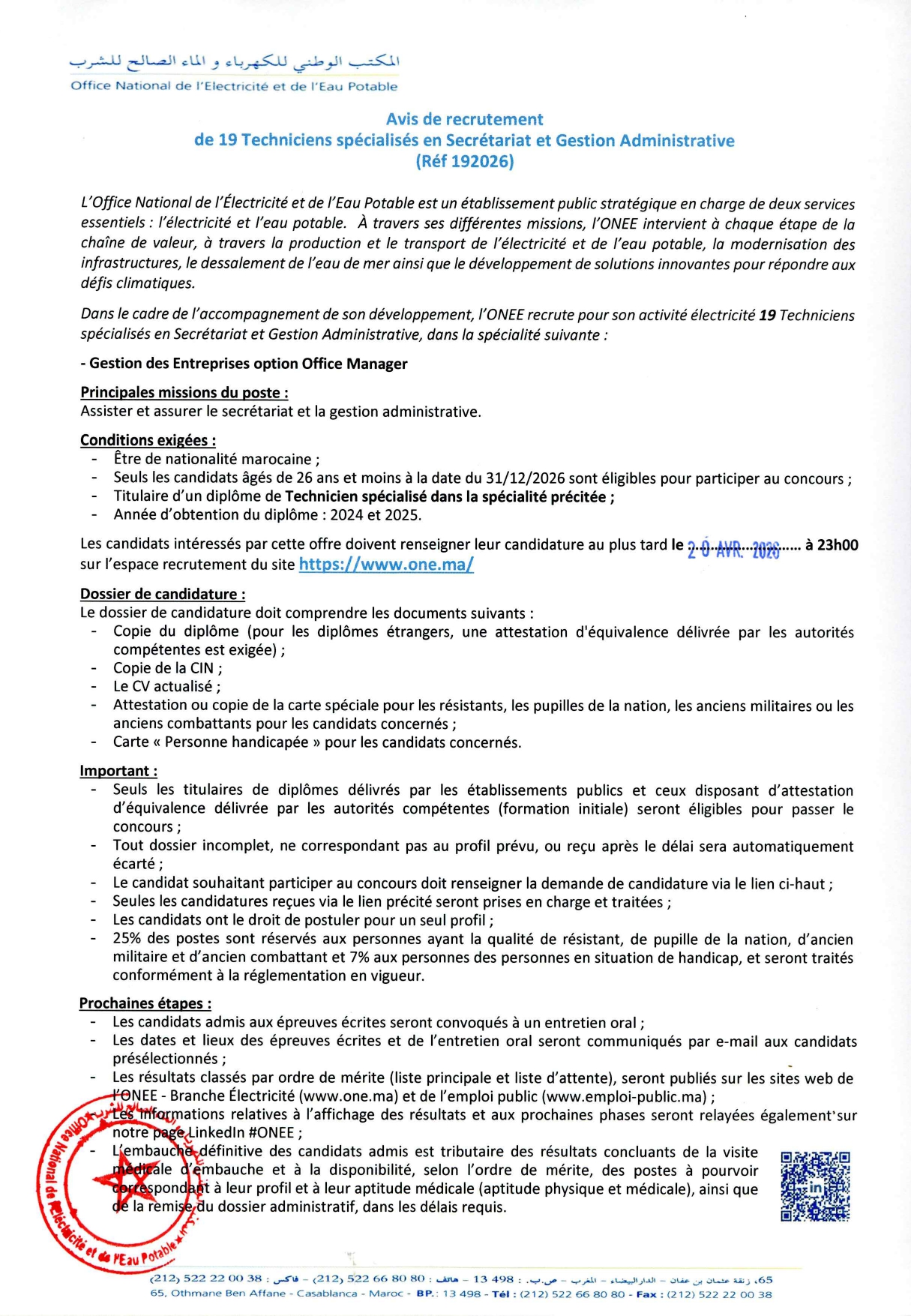 مباراة توظيف 19 تقنيين متخصصين في كتابة الإدارة والتدبير الإداري بالمكتب الوطني للكهرباء والماء الصالح للشرب قطاع الكهرباء آخر أجل 20 أبريل 2026