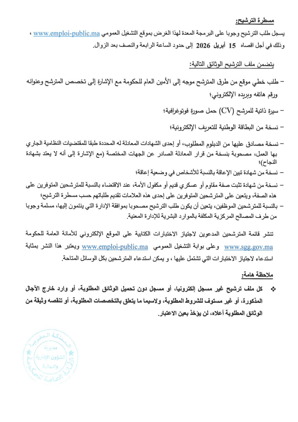 مباراة توظيف 2 تقنيين من الدرجة الرابعة بالأمانة العامة للحكومة آخر أجل 15 أبريل 2026