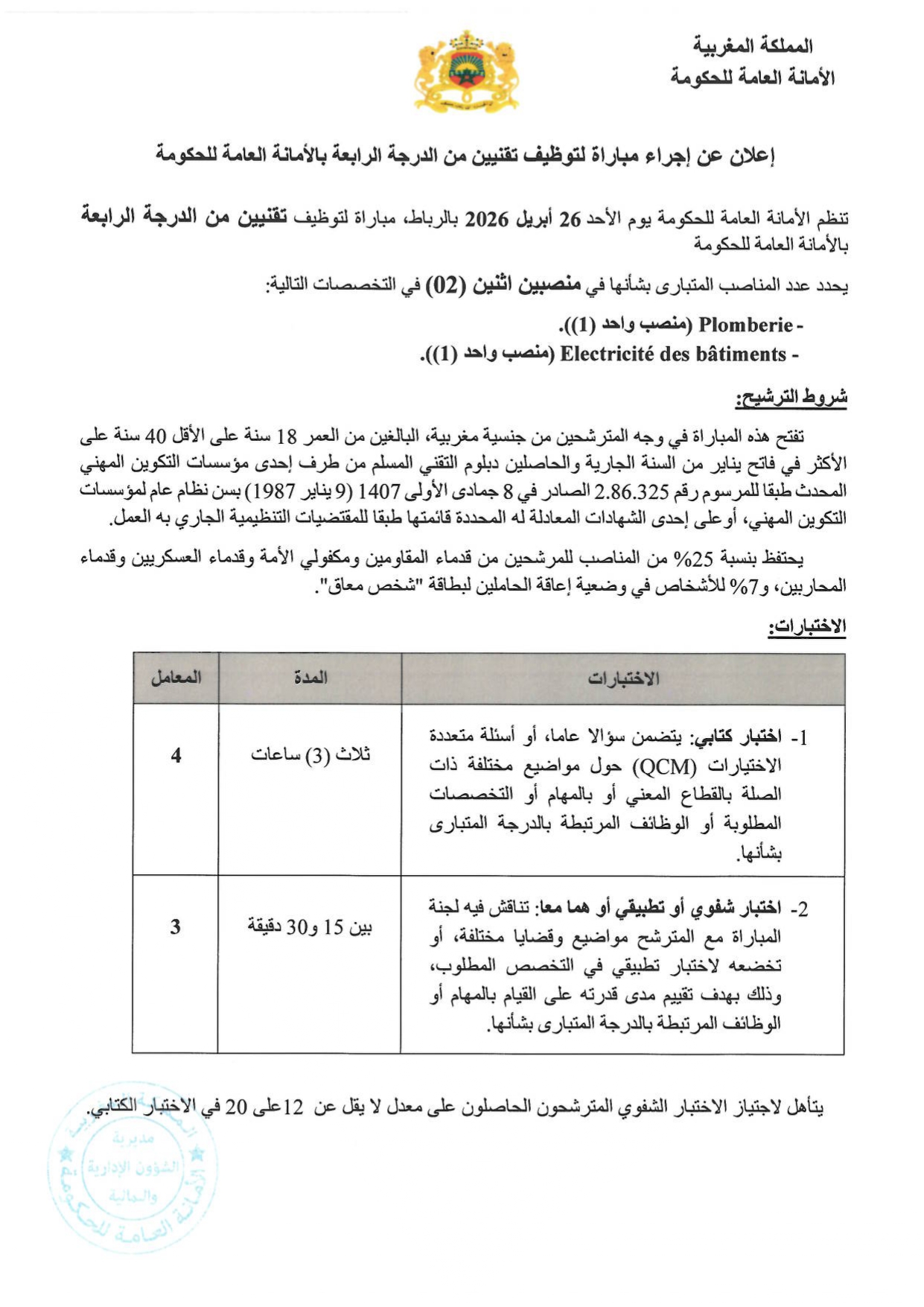 مباراة توظيف 2 تقنيين من الدرجة الرابعة بالأمانة العامة للحكومة 2026