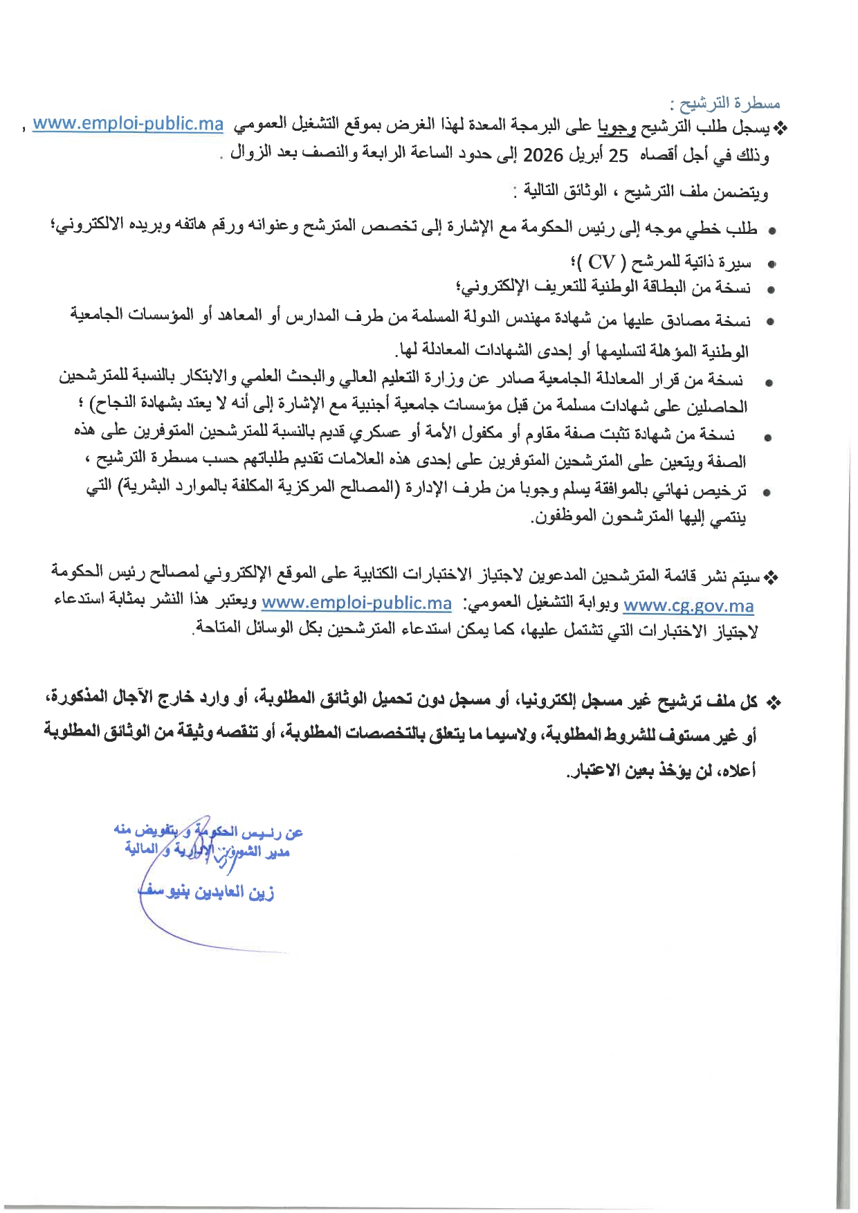 رئاسة الحكومة مباراة توظيف 2 مهندسي دولة من الدرجة الأولى آخر أجل 26 أبريل 2026