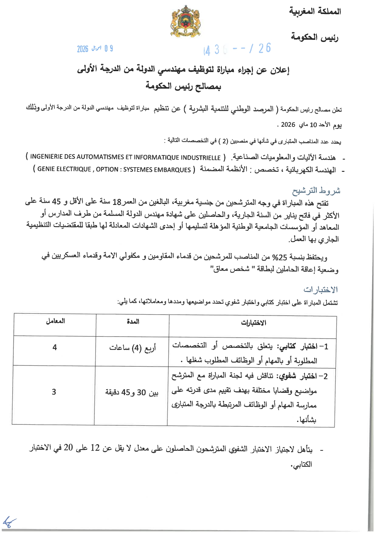 مباراة توظيف 2 مهندسي دولة من الدرجة الأولى برئاسة الحكومة آخر أجل 26 أبريل 2026