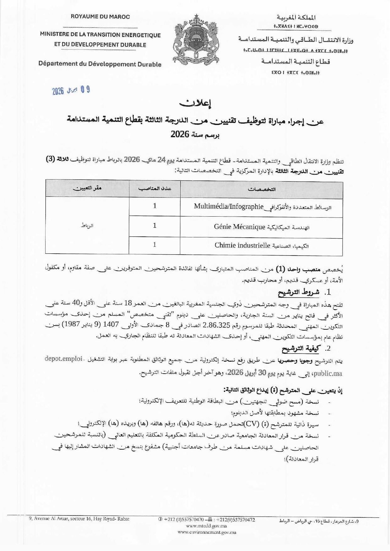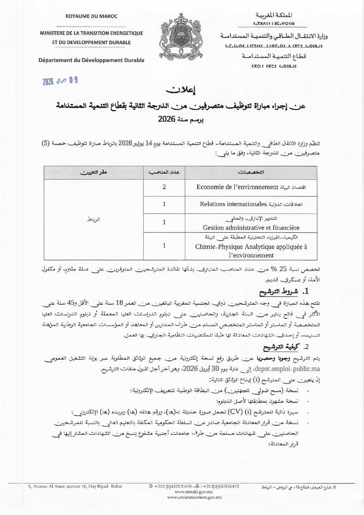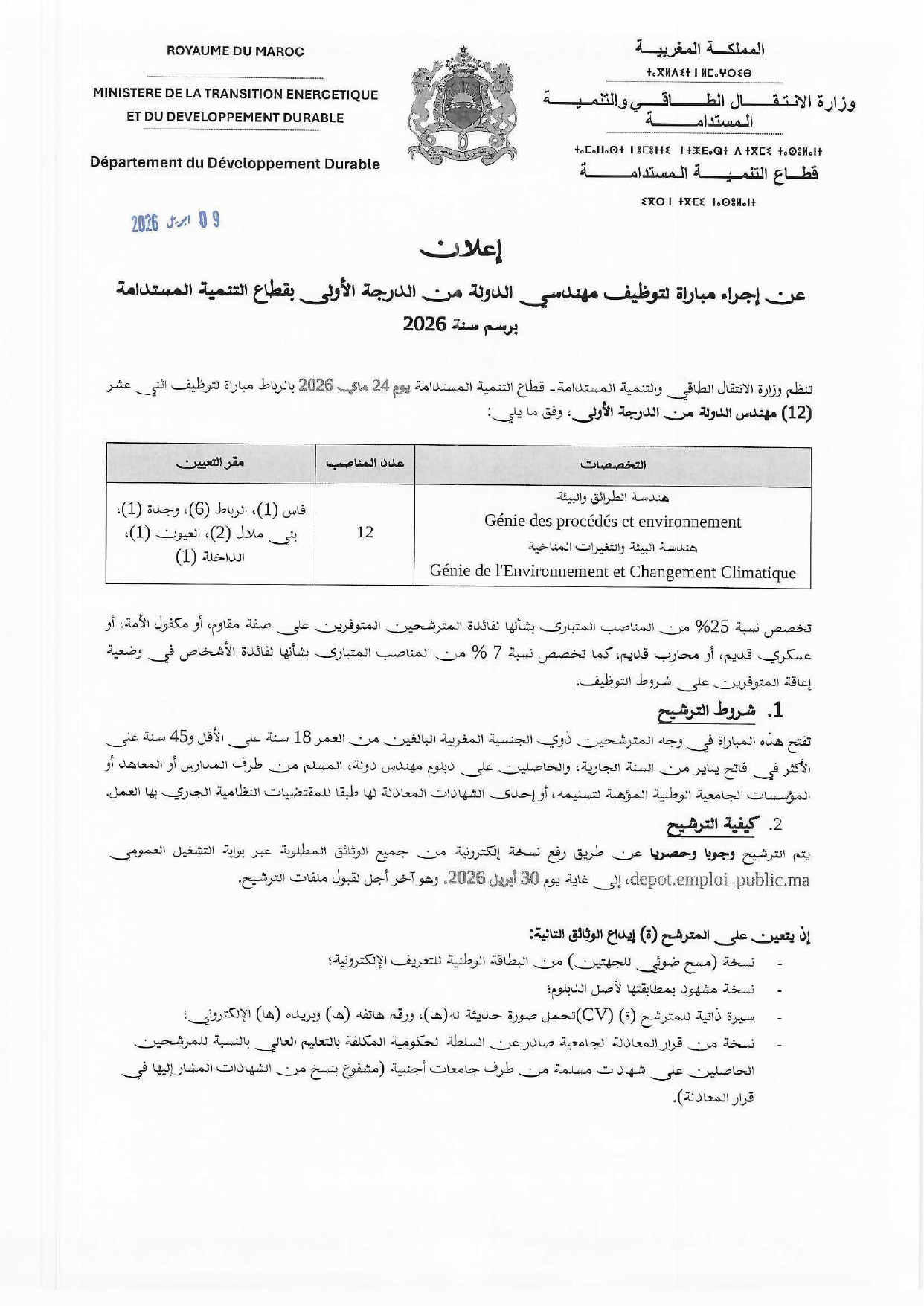 مباراة توظيف 20 منصب بوزارة الانتقال الطاقي والتنمية المستدامة آخر أجل 30 أبريل 2026