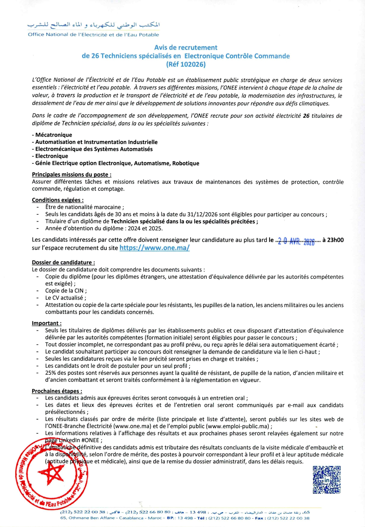 مباراة توظيف 26 تقنيين متخصصين الكترونيك بالمكتب الوطني للكهرباء والماء الصالح للشرب قطاع الكهرباء آخر أجل 20 أبريل 2026