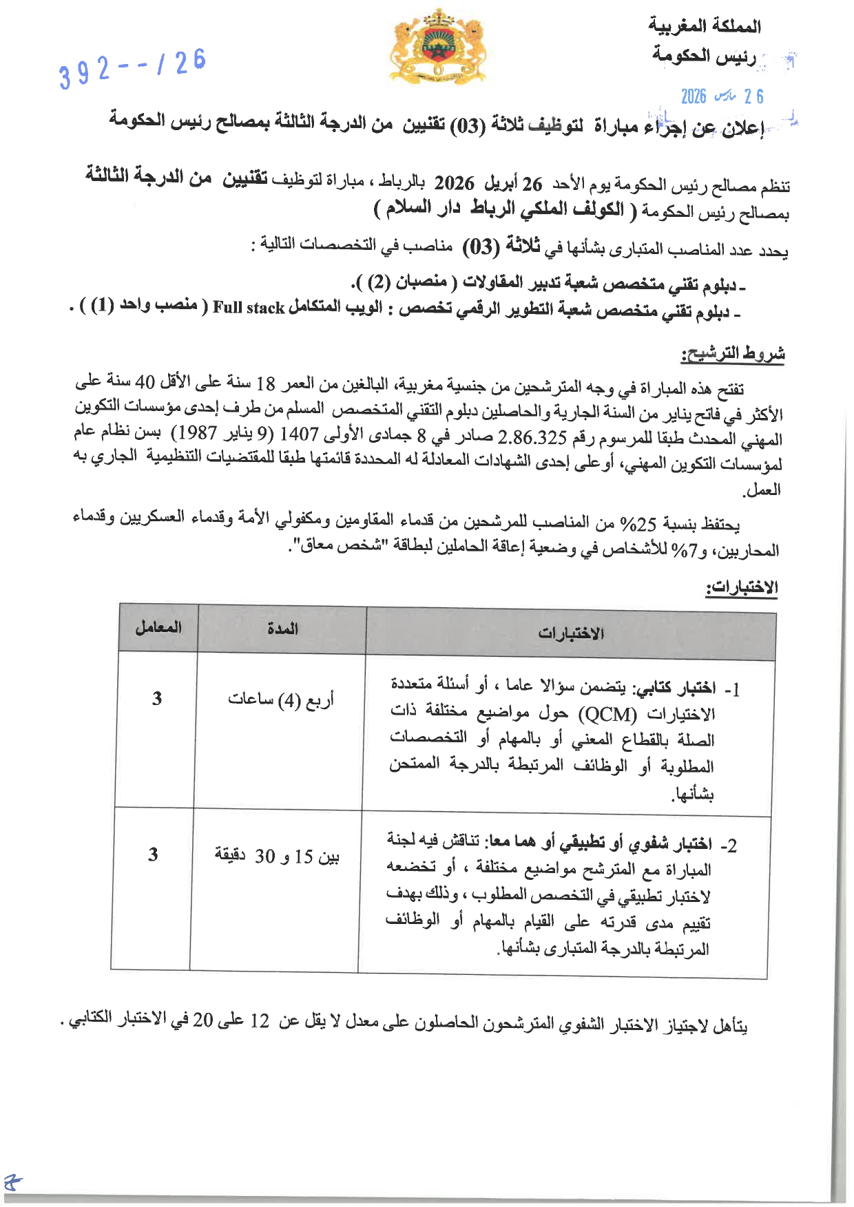 مباراة توظيف 3 تقنيين من الدرجة الثالثة برئاسة الحكومة 2026