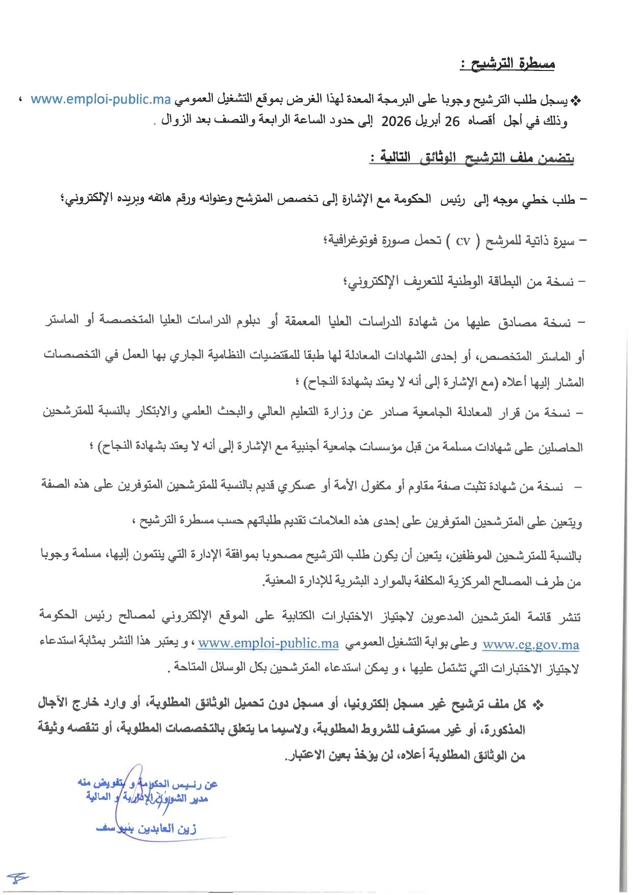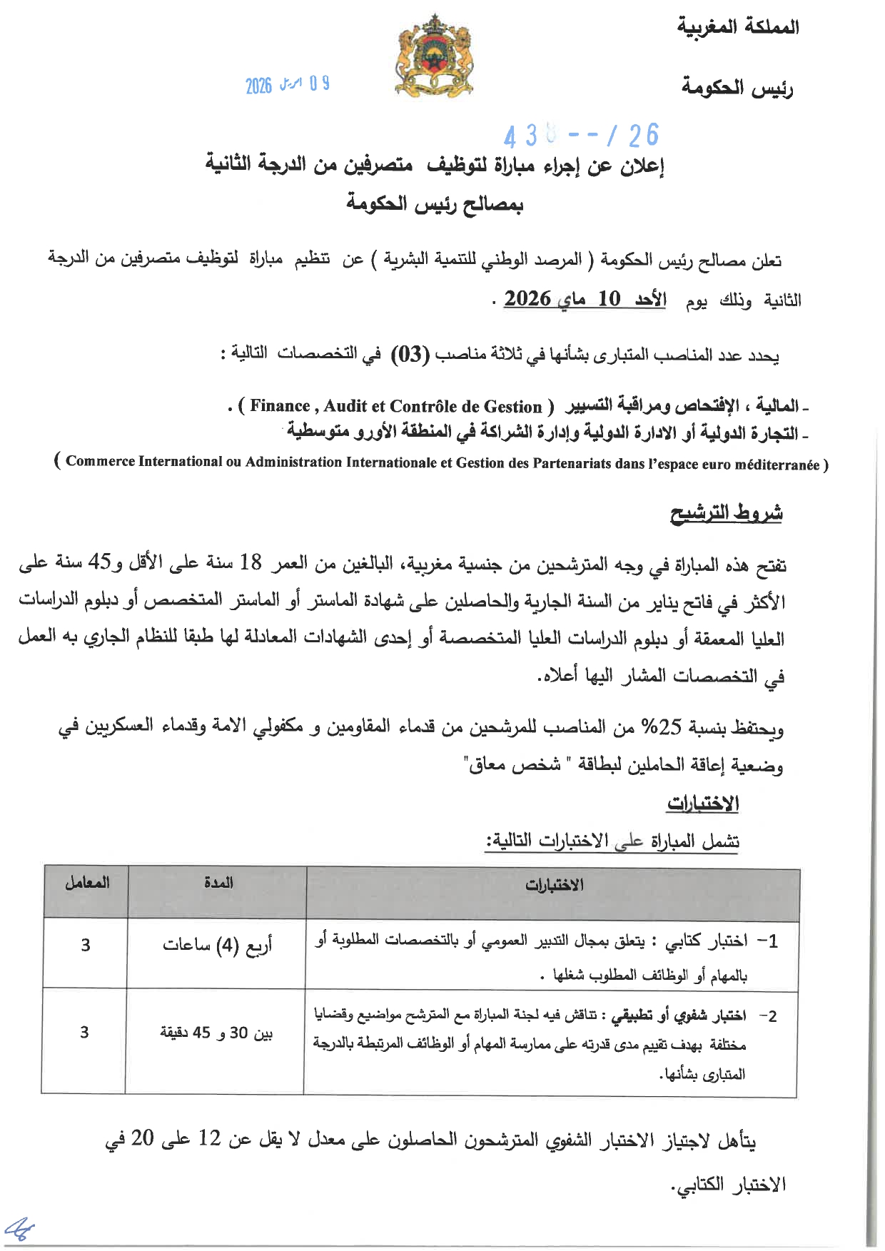 مباراة توظيف 3 متصرفين من الدرجة الثانية برئاسة الحكومة آخر أجل 26 أبريل 2026