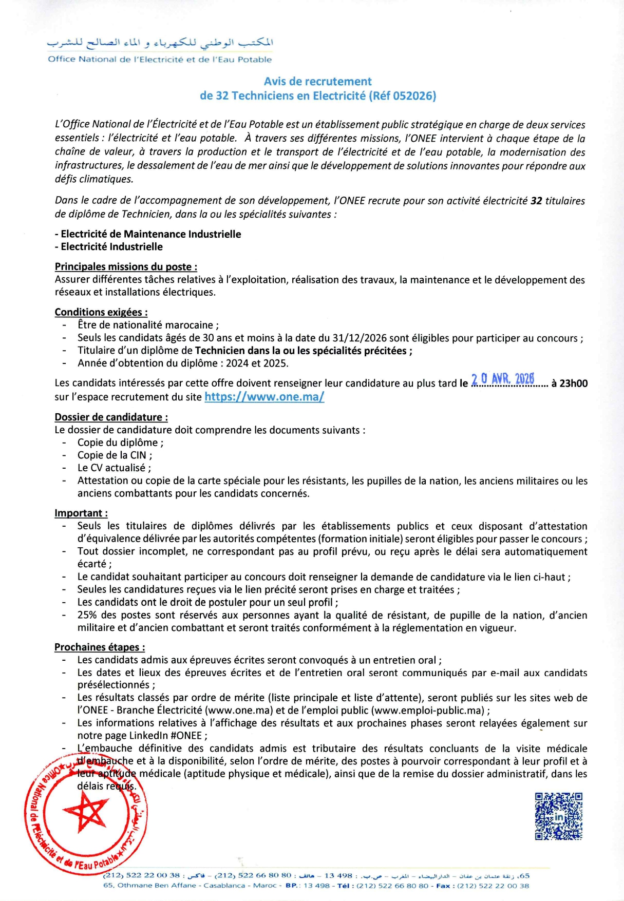 المكتب الوطني للكهرباء والماء الصالح للشرب قطاع الكهرباء مباراة توظيف 32 تقنيين كهرباء آخر أجل 20 أبريل 2026