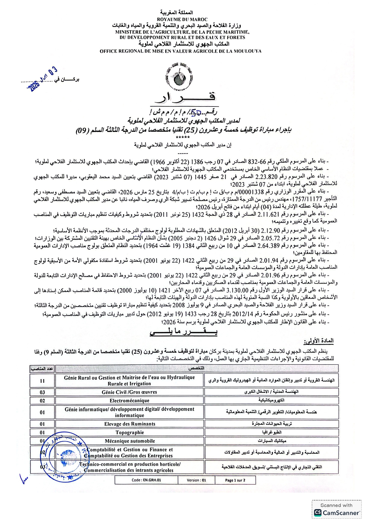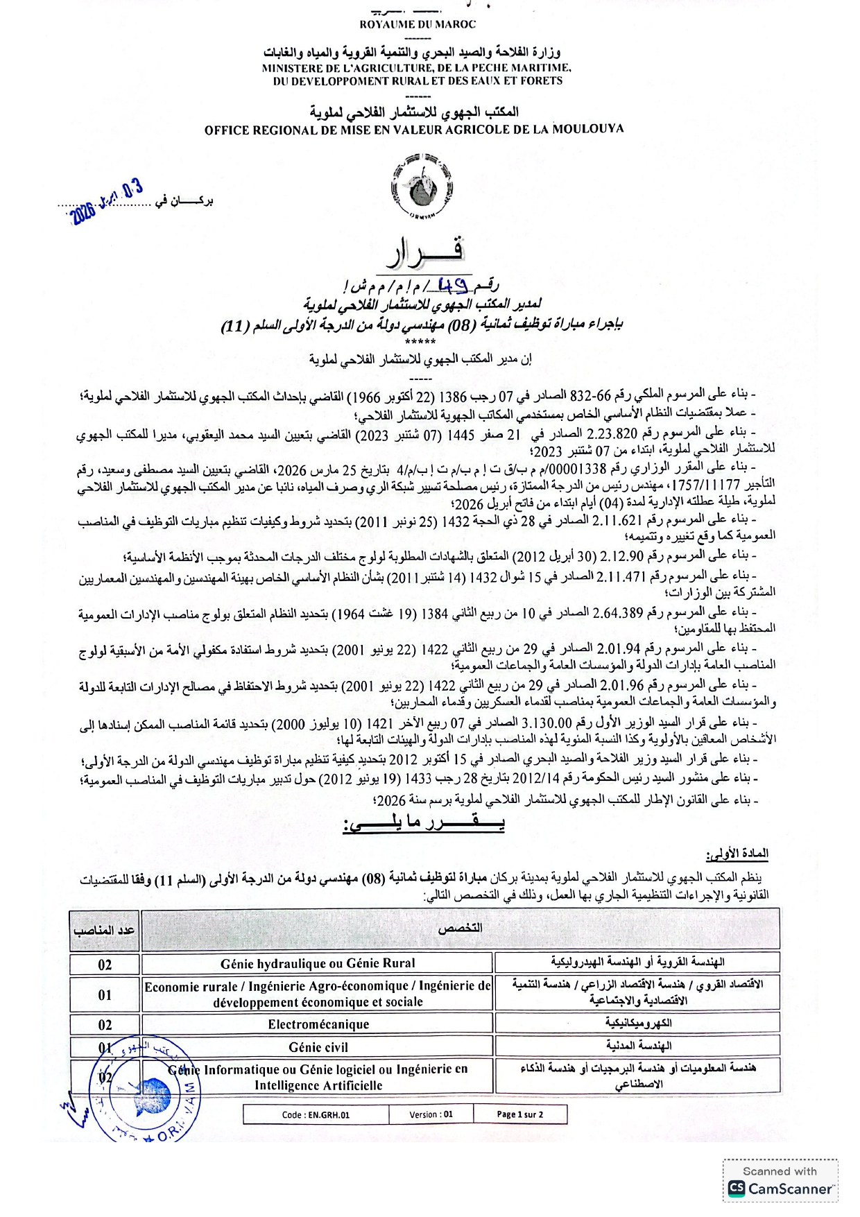 مباراة توظيف 35 منصب بالمكتب الجهوي للاستثمار الفلاحي لملوية آخر أجل 23 أبريل 2026