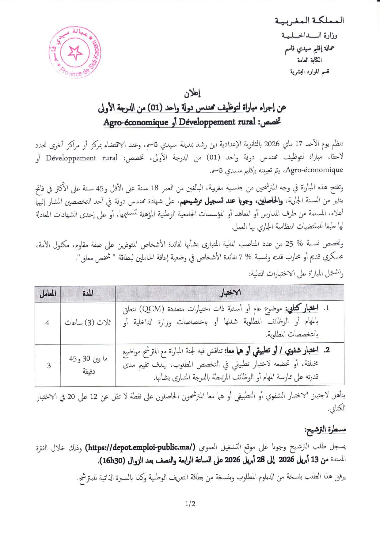 مباراة توظيف 4 مناصب بعمالة إقليم سيدي قاسم آخر أجل 28 أبريل 2026