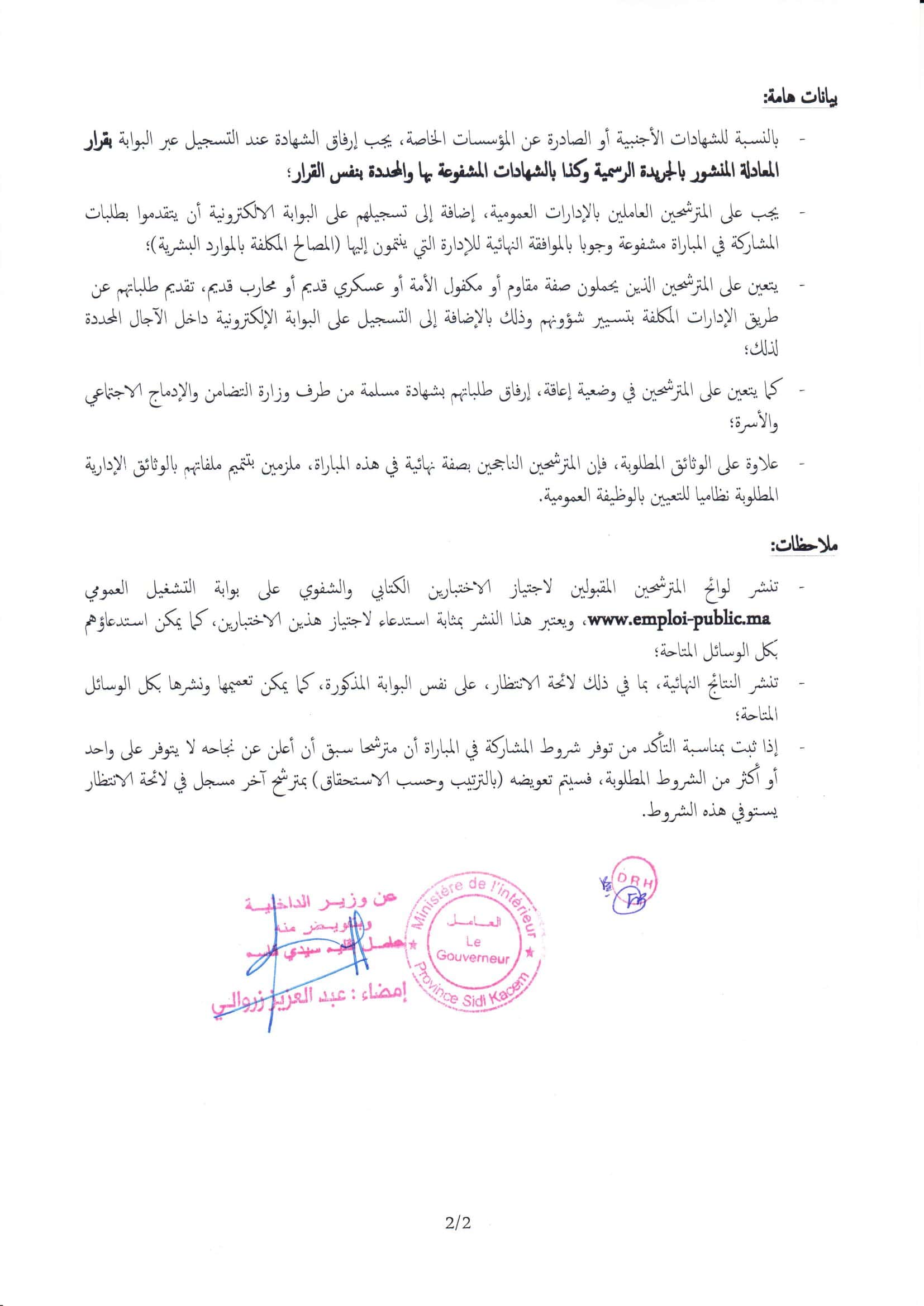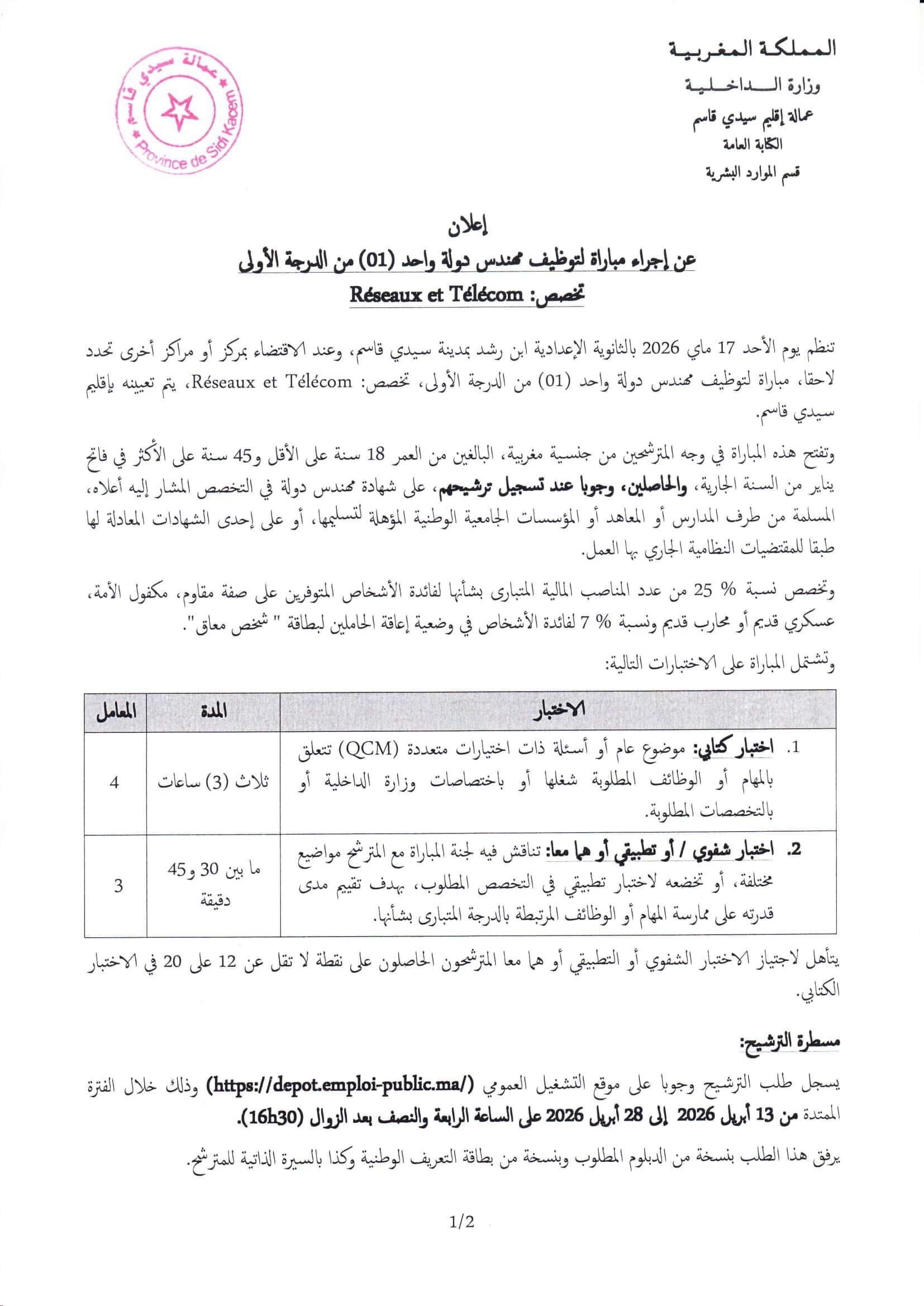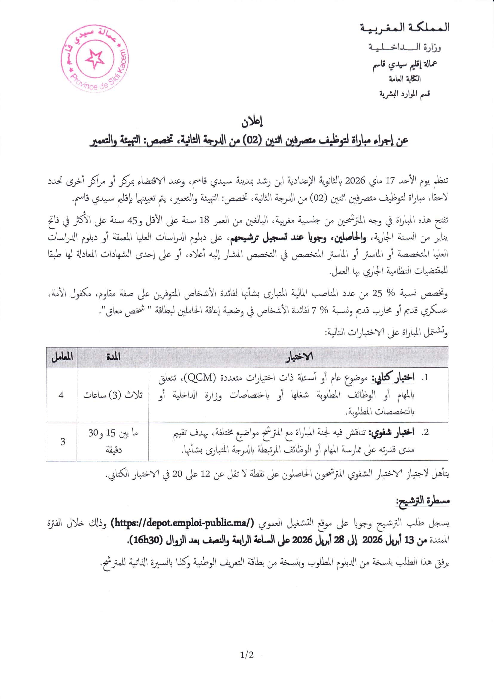 مباراة توظيف 4 مناصب بعمالة إقليم سيدي قاسم 2026