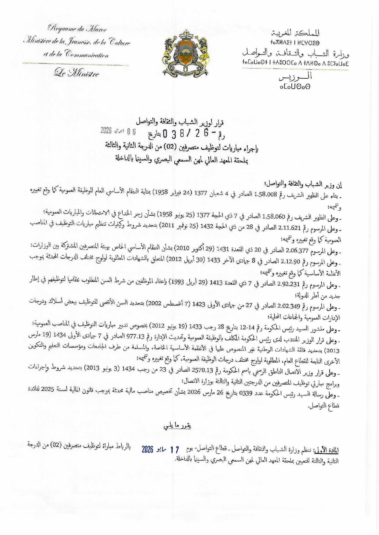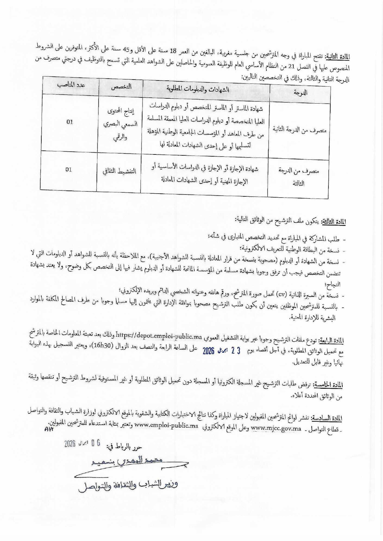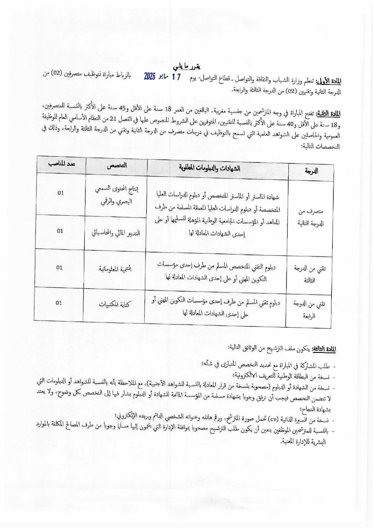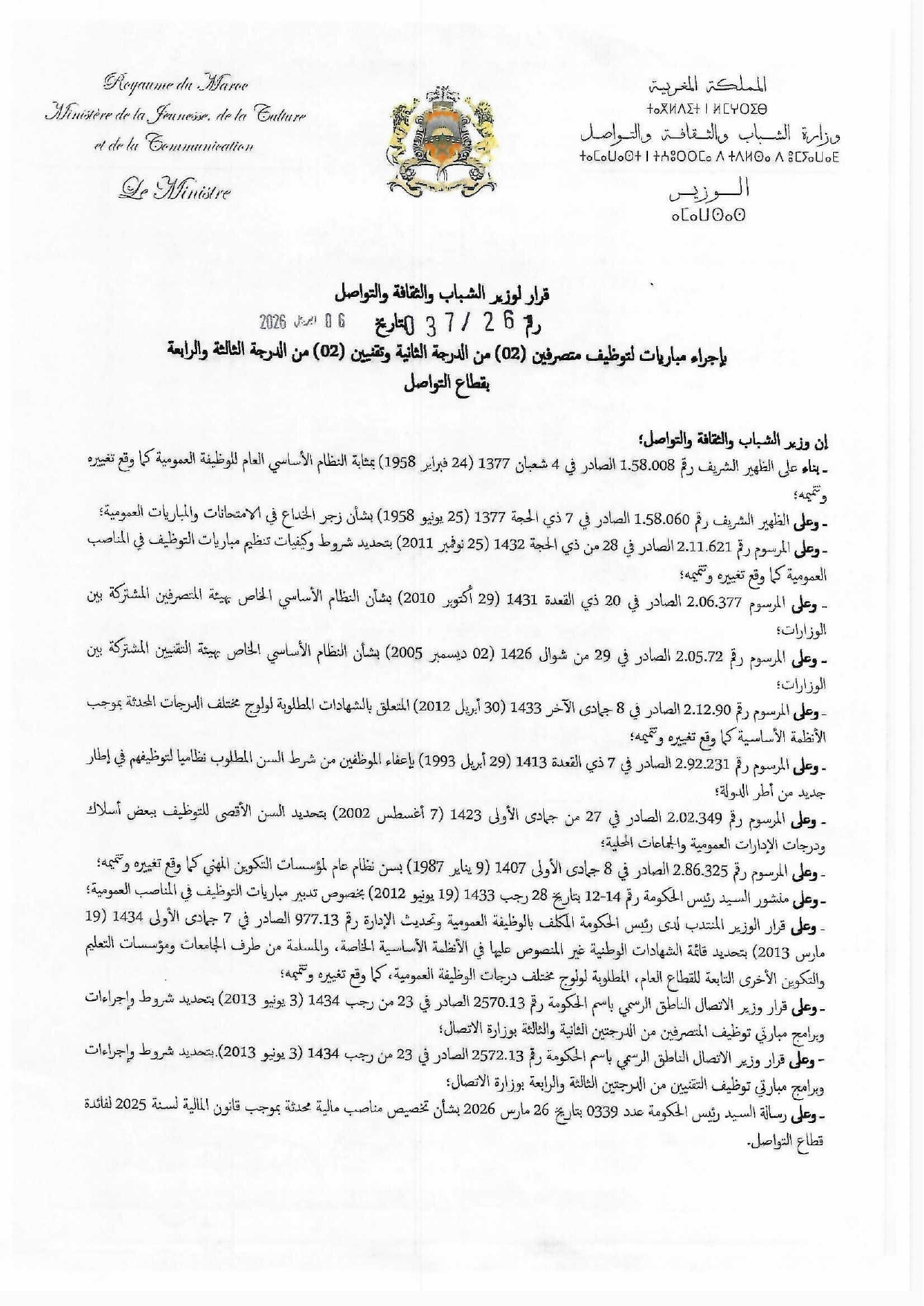 مباراة توظيف 6 مناصب بوزارة الشباب والثقافة والتواصل بقطاع التواصل آخر أجل 23 أبريل 2026