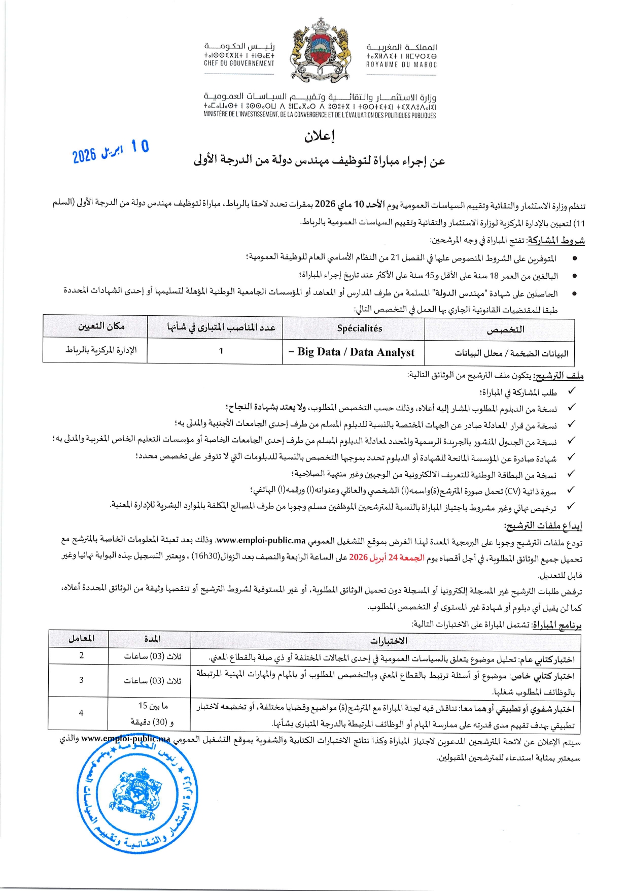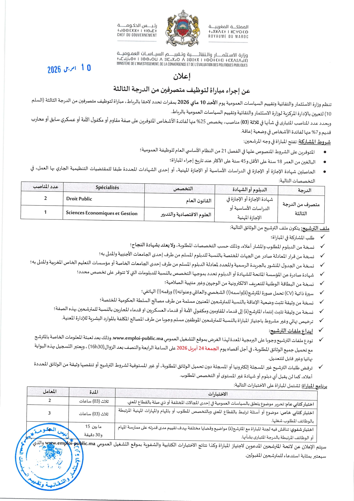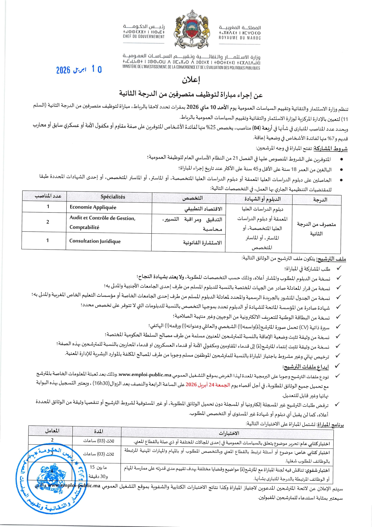 مباراة توظيف 8 مناصب بوزارة الاستثمار والتقائية وتقييم السياسات العمومية آخر أجل 24 أبريل 2026