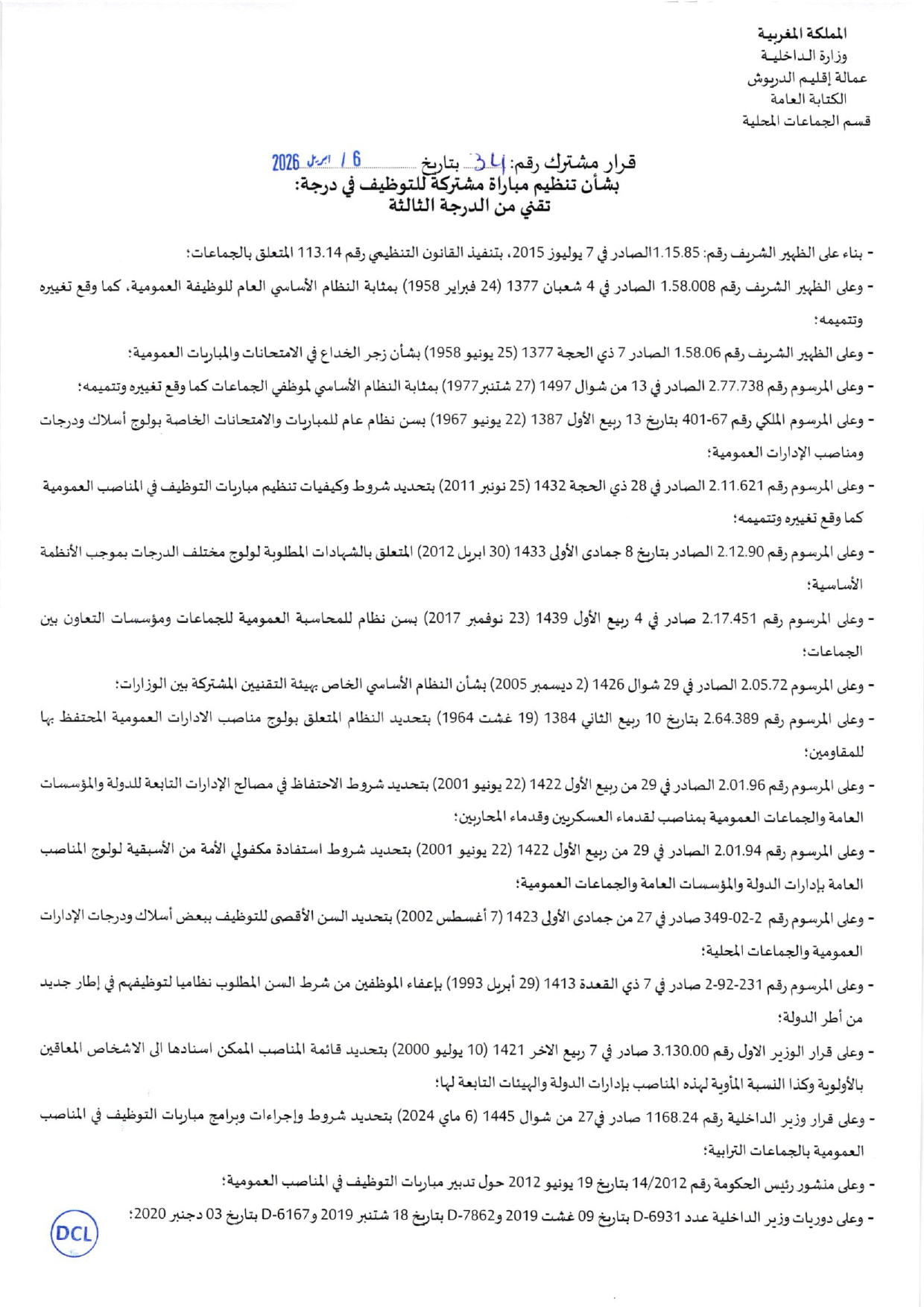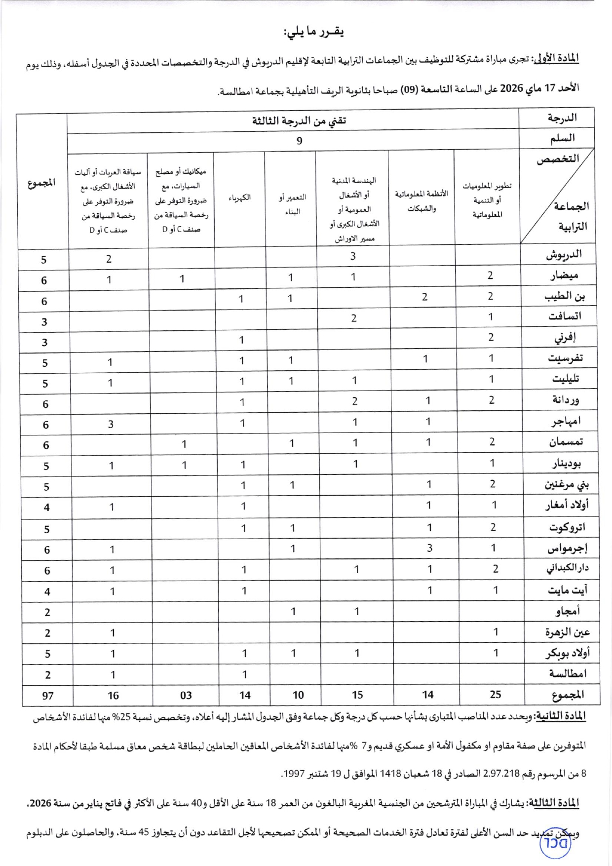 إقليم الدريوش: مباراة مشتركة بين الجماعات لتوظيف 97 تقنيا من الدرجة الثالثة في عدة تخصصات. آخر أجل للترشيح هو 30 أبريل 2026