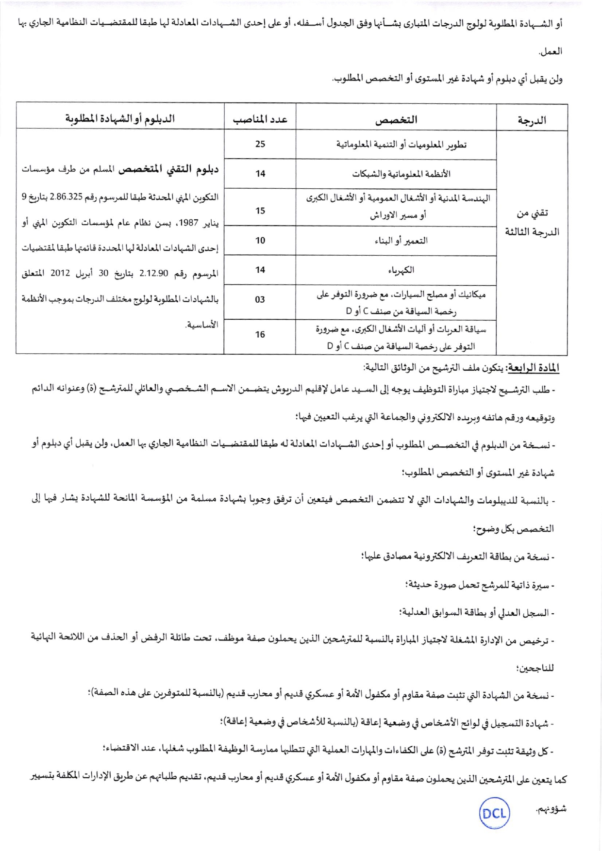 – كل وثيقة تثبت توفر المترشح(ة) على الكفاءات والمهارات العلمية التي تتطلبها ممارسة الوظيفة المطلوب شغلها، عند الاقتضاء؛