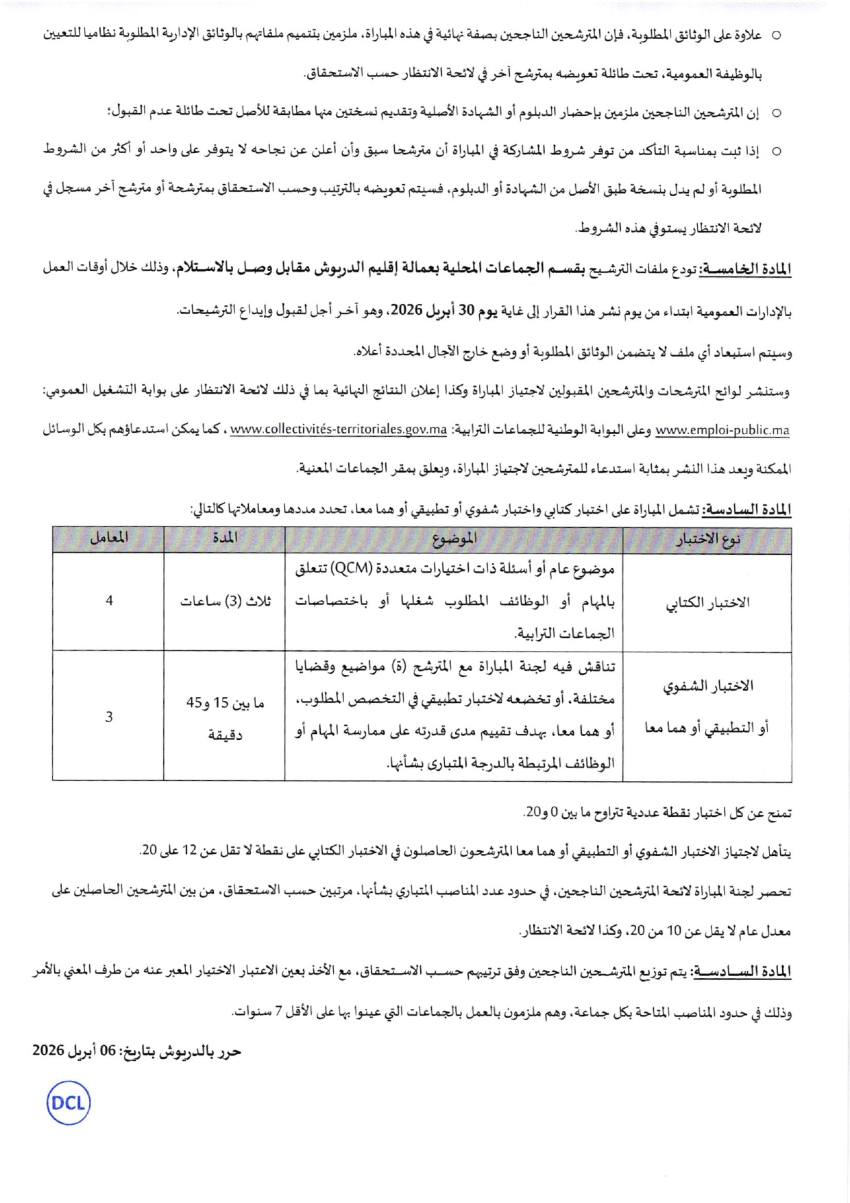 وستنشر لوائح المترشحات والمترشحين المقبولين لاجتياز المباراة وكذا إعلان النتائج بما في ذلك لائحة الانتظار على بوابة التشغيل العمومي www.emploi-public.ma وعلى البوابة الوطنية للجماعات الترابية: www.collectivites-territoriales.gov.ma، كما يمكن استدعاؤهم بكل الوسائل الممكنة ويعد هذا النشر بمثابة استدعاء للمترشيحن لاجتياز المباراة، ويعلق بمقر الجماعات المعنية.