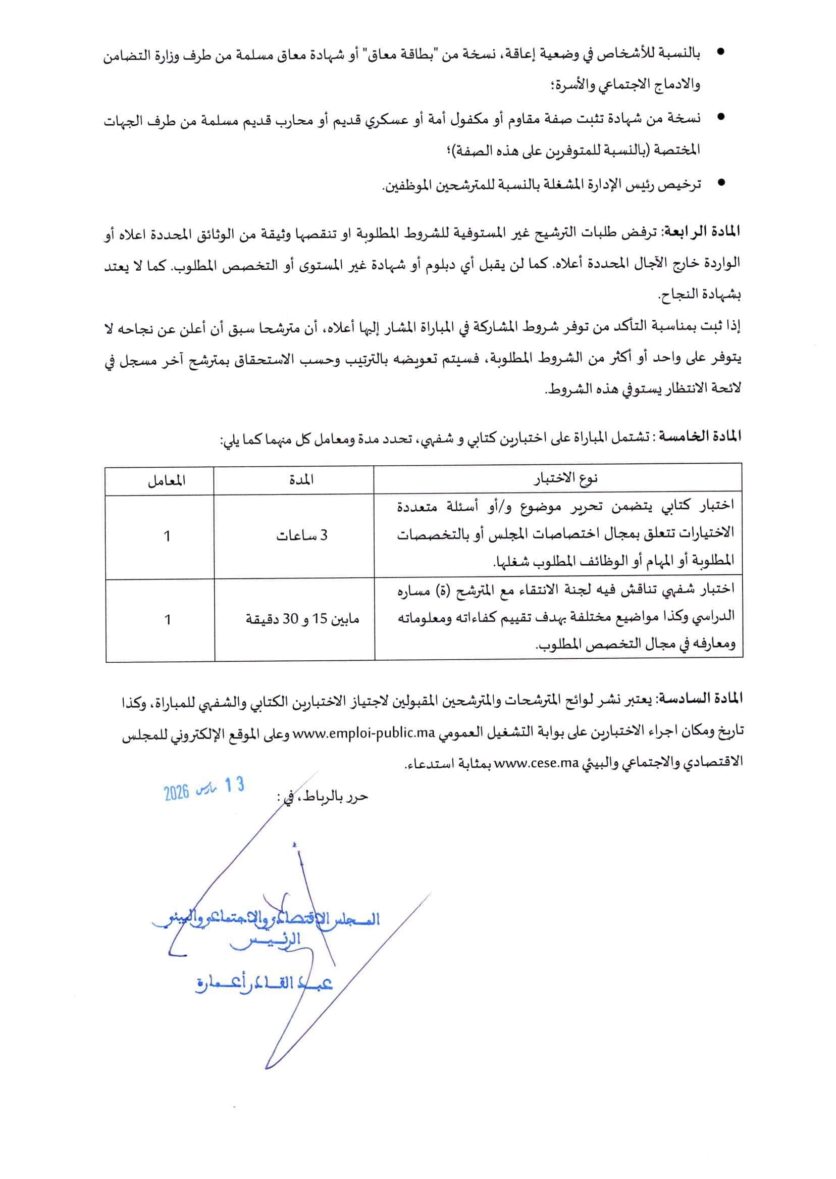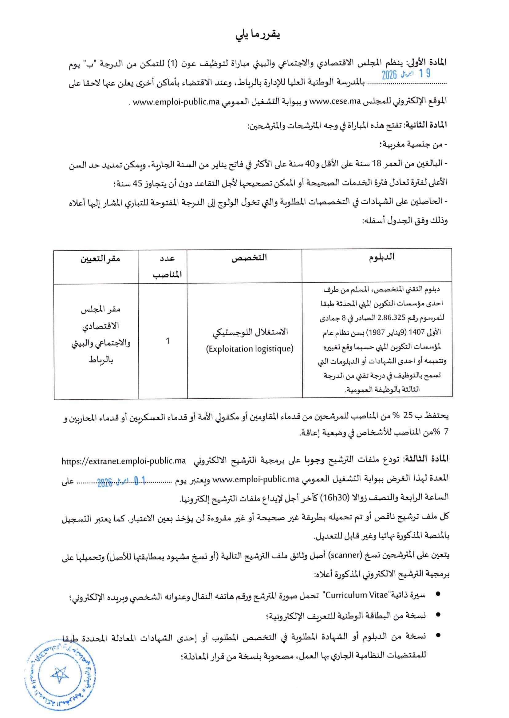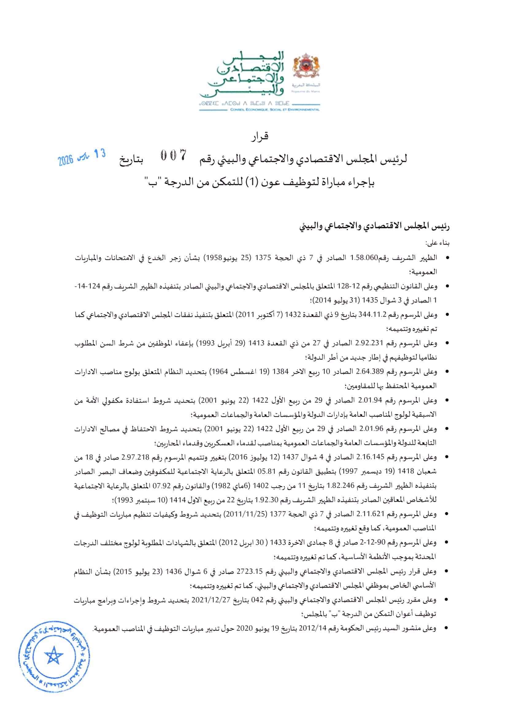 مسابقة المجلس الاقتصادي والاجتماعي والبيئي 2026 (6 وظائف)