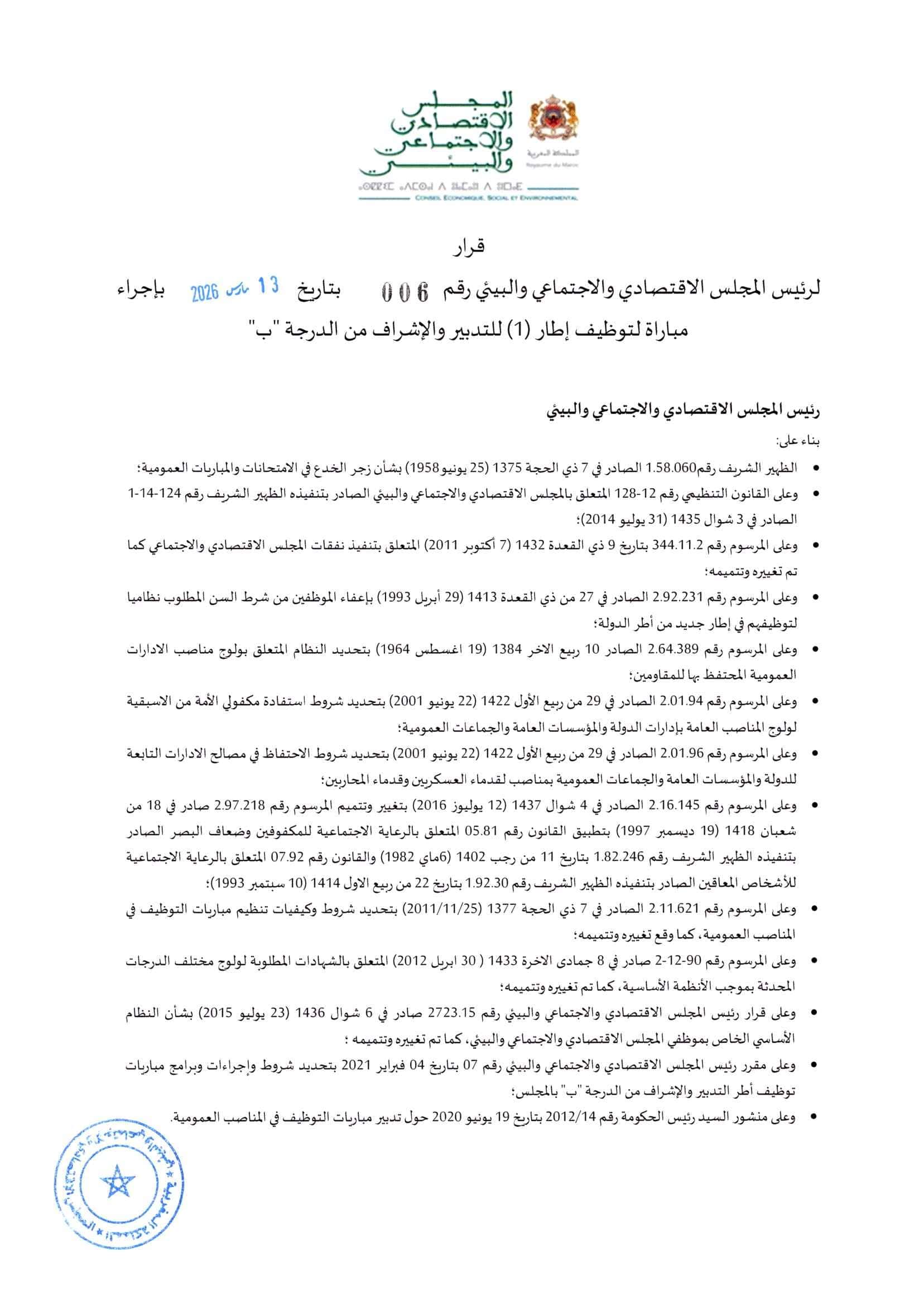مسابقة المجلس الاقتصادي والاجتماعي والبيئي 2026 (6 وظائف)