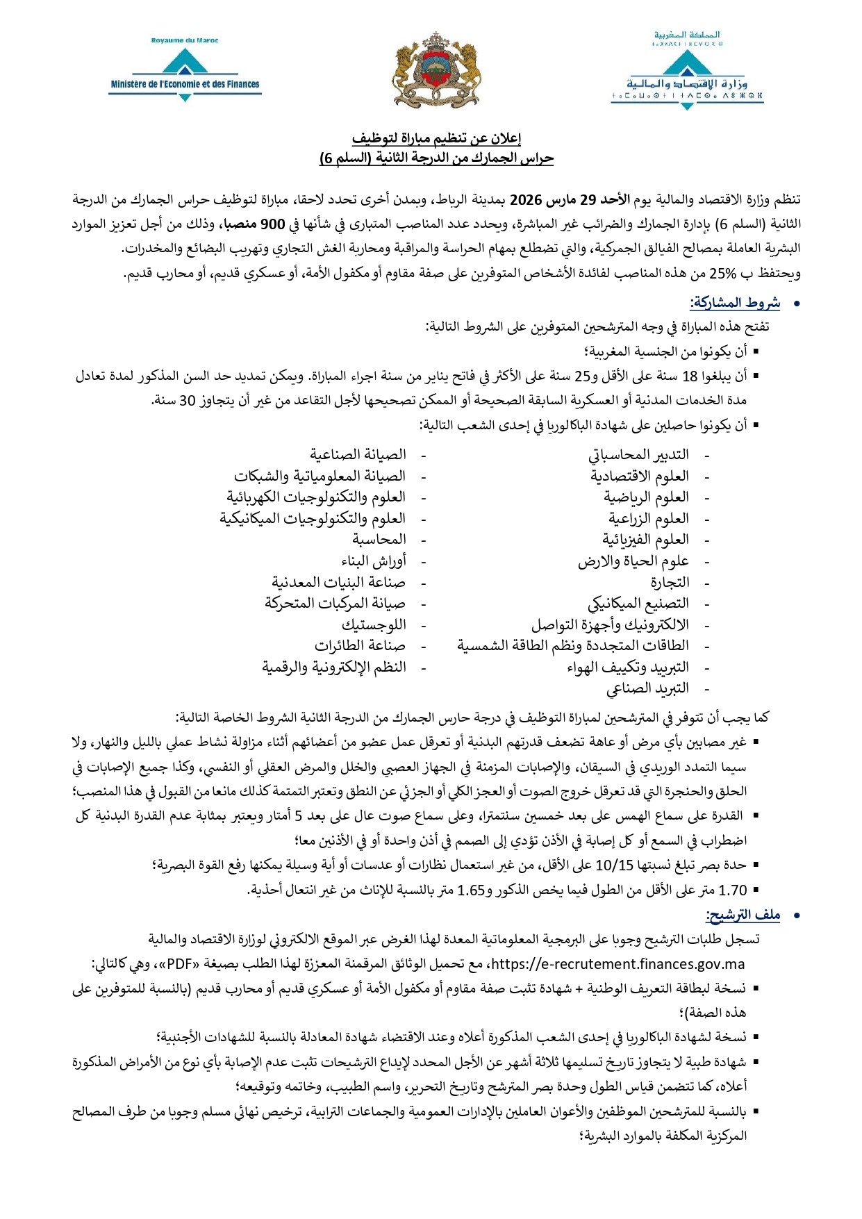 تنظم وزارة الاقتصاد والمالية يوم الأحد 29 مارس 2026 بمدينة الرباط وبمدن أخرى تحدد لاحقا، مباراة لتوظيف حراس الجمارك من الدرجة الثانية (السلم 6) بإدارة الجمارك والضرائب غير المباشرة، ويحدد عدد المناصب المتبارى في شأنها في 900 منصبا، وذلك من أجل تعزيز الموارد البشرية العاملة بمصالح الفيالق الجمركية، والتي تضطلع بمهام الحراسة والمراقبة ومحاربة الغش التجاري وتهريب البضائع والمخدرات.