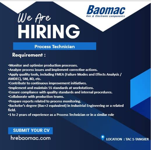 Baomac recrute 2 profils, un technicien de process et un chef d’équipe de production à Tanger, en contrat selon les conditions définies par l’entreprise. Les postes s’adressent à des profils techniques disposant d’une formation Bac+2 ou Bac+2/3 et d’une première expérience en environnement industriel de production.